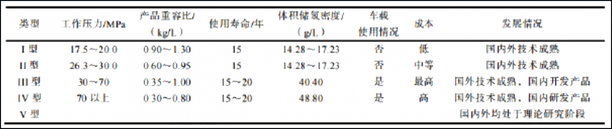 高壓氣態儲氫是目前發展最成熟、各廠商采用最多的儲氫技術,其關鍵是儲氫瓶。對于儲氣瓶,全球呈現出從I型儲氫瓶到IV型儲氫瓶的技術發展趨勢。儲氫瓶類型及性能。