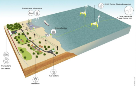 英國Dolphyn項目總裝機容量400萬千瓦,將電解制氫模塊和風力發(fā)電模塊集成在半潛式風機平臺上,氫氣通過北海現(xiàn)有油氣管道輸往英國本土。