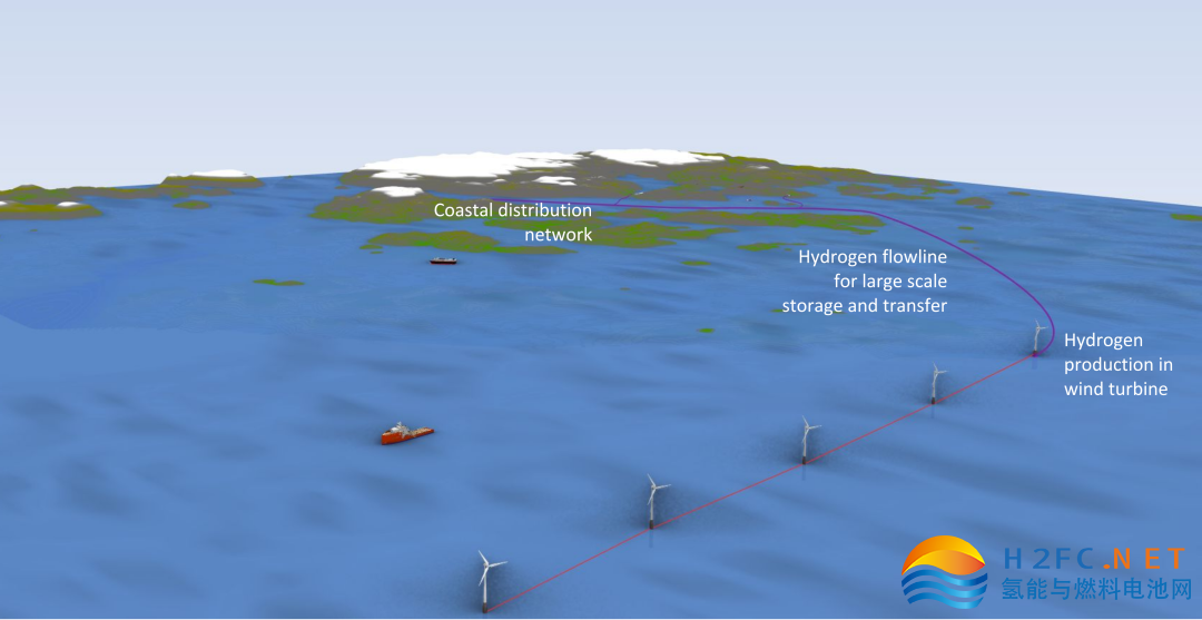 挪威Deep Purple項目風機產(chǎn)生的電能全部在風機平臺上進行電解制氫,通過海管輸送到陸地。