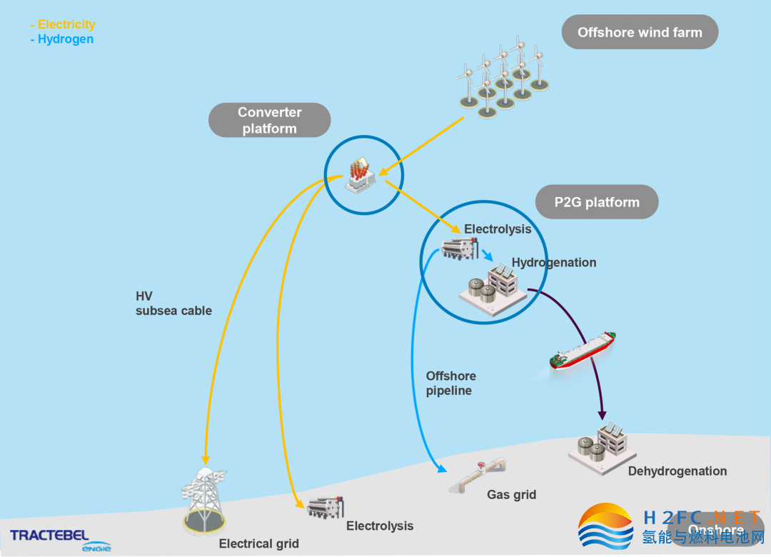 比利時Tractebel Overdick項目將400MW海上風電場的電能送至海上升壓站。升壓站將一部分電力輸送至陸地并網(wǎng)進行陸地電解槽電解制氫,另一部分電力用于在新建固定式制氫平臺上進行電解制氫,產(chǎn)生的氫氣儲存在地下鹽穴中,通過穿梭油輪或海底管道輸送至陸地氫網(wǎng)。