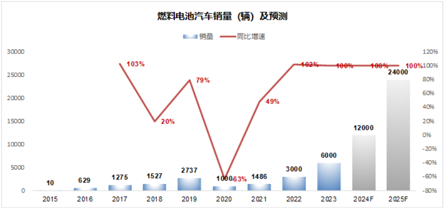 假如到2025年完成5萬輛的保有量,未來兩年需要燃料電池汽車銷量翻倍,2024年1.2萬輛,2025年2.4萬輛。市場上很多人質疑這個目標是不是能完成。