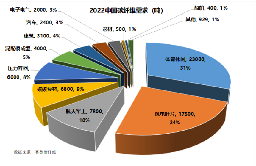 從量上看,現在碳纖維的市場并不大。根據賽奧碳纖維的數據,2022年全球碳纖維需求量是13.5萬噸,中國的年需求量是7.44萬噸,占到一半以上。