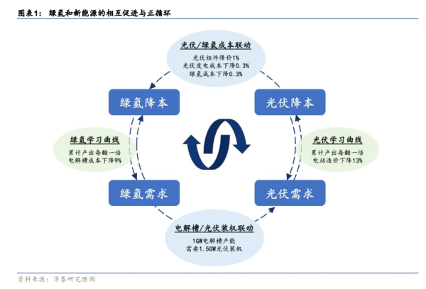 華泰證券最近有篇報告,畫了一張光伏和綠氫成本聯動的圖。核心的意思就是光伏降本遵循摩爾定律,而綠氫由光伏電解水制成,光伏降本會帶來綠氫成本的不斷下降,隨著綠氫成本的下降,就會解鎖越來越多的應用,反過來又會帶動光伏的需求。這是一個循環。