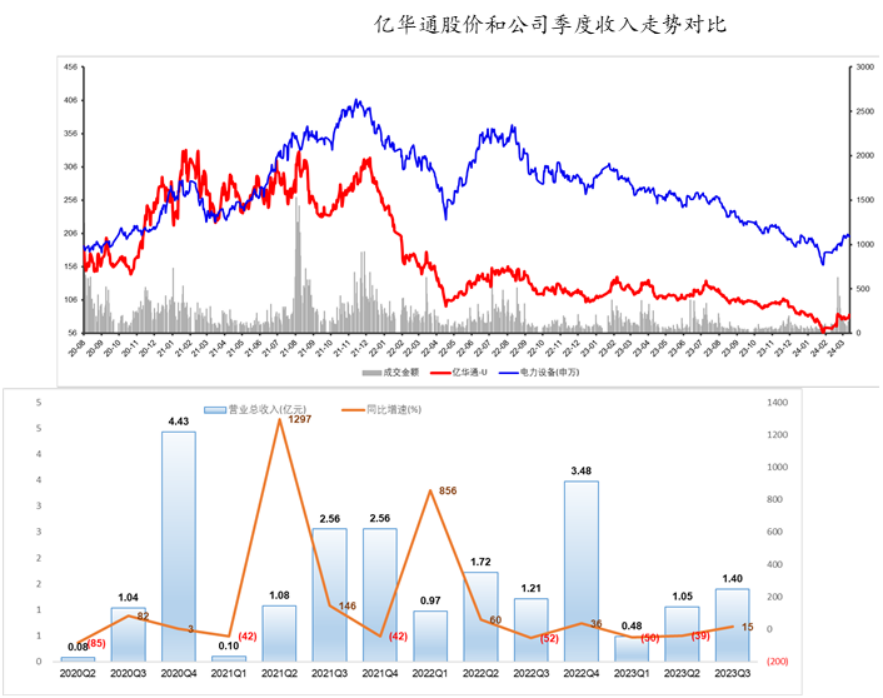 說到股價,讓我們先看億華通,這個燃料電池系統的龍頭。自2020年上市之后,公司的收入雖然增速一般,但還是跟著電力設備行業漲了很長一段時間,一直到2022年初見頂,然后就是隨著行業,股價一路向下。當然從收入增速上看,2022、2023兩年,收入同比增速顯然是下臺階的。原因就是雖然燃料電池系統的銷量是漲的,但是架不住單價下的太快,2020年單KW還能有個1.5-2萬,到了2023年就只有3000,這個降幅顯然太快了。