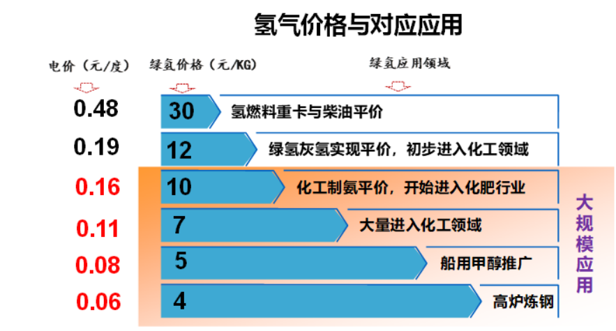 當光伏電價降到0.19元每度時,對應的綠氫價格是12元每公斤,這個時候的綠氫價格跟最便宜的煤制氫價格打平,一些單獨需要氫氣的化工流程,可以選擇綠氫,雖然整體應用并不多。