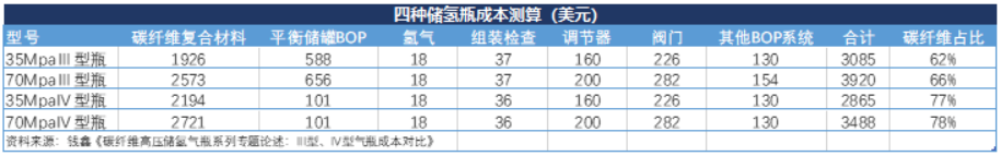 從儲氫瓶的發展趨勢看,70Mpa的Ⅳ型瓶將是主流,最主要的成本大頭是碳纖維。