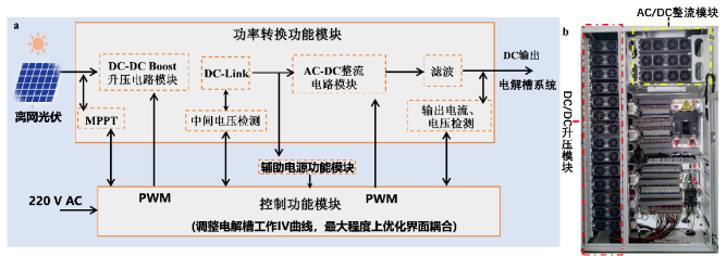 依據光照能源波動性的特點,蘇州科技大學唐叔賢院士團隊采用IGBT方案開發設計了新型的離網光伏制氫電源,預留交流電(AC)接口,融合DC/DC和AC/DC電源轉化模塊,動態追蹤光伏的最大輸出功率點(MPP),通過優化系統軟件算法實現直流電(DC)和交流電(AC)耦合轉化成電解槽所需的直流電(DC),使制氫電源可穩定輸出約200V電壓,并根據光照強度變化動態改變輸出電流,進而調整電解槽工作IV曲線,最大程度上優化界面耦合,使得光伏直流電轉換成電解槽所需直流電的效率達到96%,完美匹配電解槽運行工況,運行過程中氫氧純度達到電解槽的設計標準。未來制氫電源的AC接口可以接入風電,實現純離網風光互補耦合制綠氫。