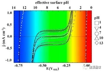 具體來說,隨著電解電流密度的增加,電極表面局部酸堿度會急劇變化(圖3:在H2飽和、無緩沖的pH1——13溶液中,通過循環伏安法獲得的電流密度-表面酸堿度關系),因此可能導致Ca(OH)?和Mg(OH)?沉淀的形成,并阻塞陰極活性位點。