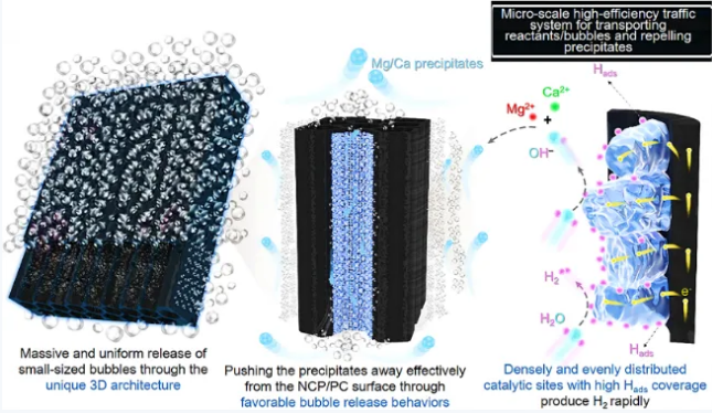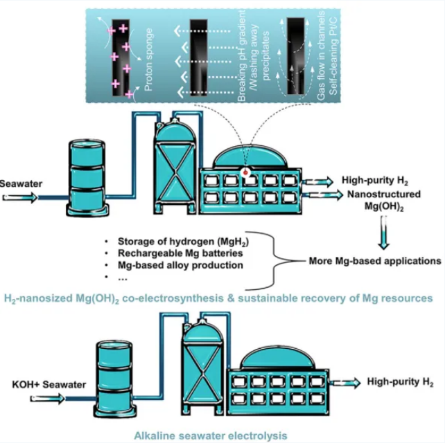 針對天然海水直接電解中陰極上鎂鈣(Mg2+/Ca2+)沉淀嚴重,電極活性位點被覆蓋的難題,團隊首次提出基于三維蜂窩電極的微氣泡/沉淀輸運系統,展示了具有高海水還原性能的獨特電極構造。為海水電解存在的陰極沉淀問題提出了可靠的解決方案,并揭示了卓越抗沉淀性能的普遍原則(Nat. Commun., 2024, 15, 2950)。團隊進一步探究了陰極抗沉淀的三種潛在策略,展示了從天然海水中共同電合成納米級氫氧化鎂和氫氣的可能性,提出了氫氣生產、氫氣儲存和鎂資源回收的建議工藝(Chem, 2024, DOI: 10.1016/j.chempr.2024.05.018)。