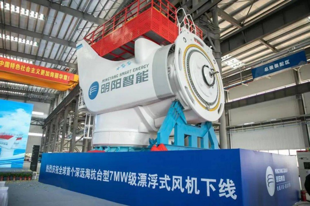 與此同時,全球首臺7MW級抗臺風漂浮式風機——MySE7.25-158正式下線。該機組針對深遠海環境定制,采用全球領先的半直驅、抗臺風、漂浮式技術,最高可抵抗17級臺風,應對復雜洋流和波浪,單臺機組每年可輸出3600萬度清潔電能,可滿足10000個三口之家1年家庭正常用電,可減少燃煤消耗6500噸,減少二氧化碳排放18200噸。