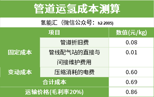 管道壽命20年,以直線法進行折舊。根據以上假設,可測算出長度25m、年輸送能力10.04萬噸的氫氣管道,運氫價格為0.86元/kg。