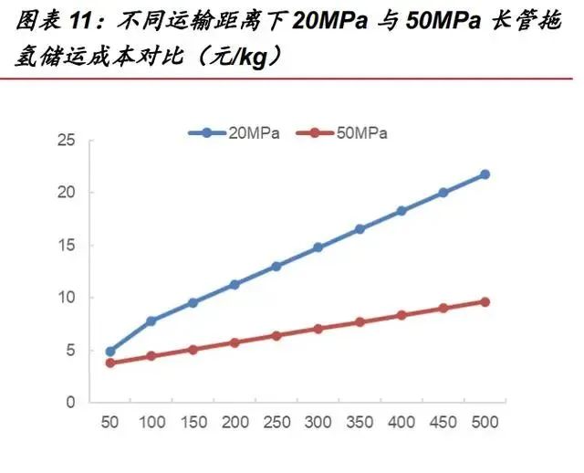 由于氫氣密度很小,而儲氫容器自重大,所運輸氫氣的重量只占總運輸重量的1~2%之間。據中石油化工研究院數據,當運輸距離為50km時,氫氣的運輸成本為4.9元/kg;隨著運輸距離的增加,長管拖車運輸成本逐漸上升,當距離500km時運輸成本近22元/kg,因此長管拖車運氫只適用于運輸距離較近(運輸半徑200公里)和輸送量較低的場景。