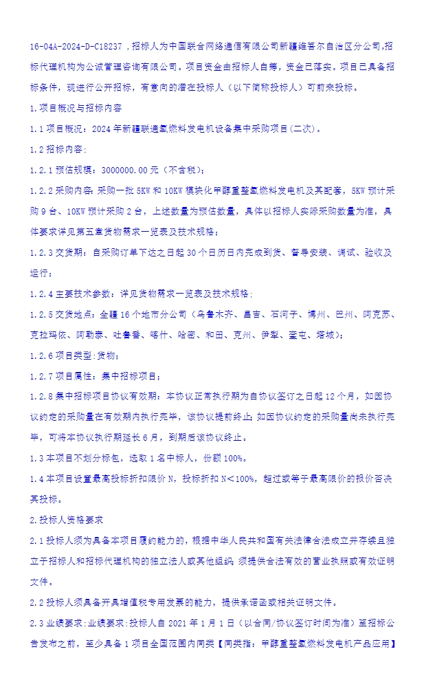 8月30日,中國招標采購網發布2024年新疆聯通氫燃料發電機設備集中采購項目(二次)招標公告。