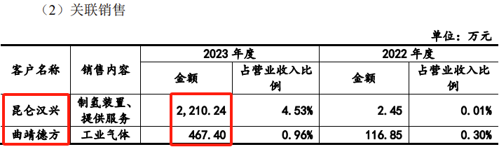 2023年,公司分別向昆侖漢興、曲靖德方實現關聯銷售2210萬元、467萬元,合計2677萬元。這一關聯銷售占2023年銷售增量9920萬元的26.99%,為2023年營收實現同比增長做出了較大貢獻。