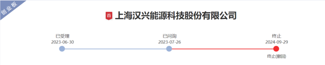 2024年9月29日,深交所公告顯示:上海漢興能源科技股份有限公司(簡稱:漢興能源)IPO終止,直接原因是公司及保薦機構撤回申報/保薦。