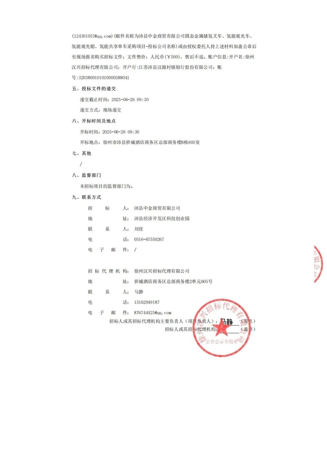 6月5日,沛縣中金商貿有限公司固態金屬儲氫叉車、氫能觀光車、氫能觀光船、氫能共享單車采購項目公開招標公告。