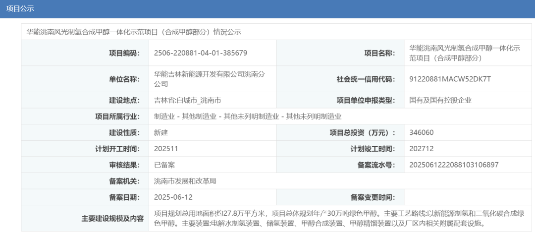 6月12日,華能洮南風(fēng)光制氫合成甲醇一體化示范項(xiàng)目(合成甲醇部分)情況公示,該項(xiàng)目取得備案。