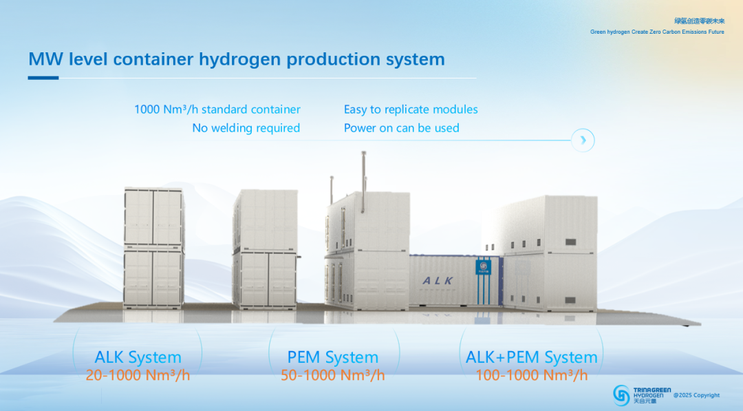 畢孫海玲認為,推動氫能技術發(fā)展的關鍵在于持續(xù)創(chuàng)新與突破,避免陷入同質(zhì)化競爭的困境。面對復雜的能源應用環(huán)境,天合元氫以多變應萬變。從MW級PEM制氫裝備、MW級堿性制氫裝備到MW級集裝箱制氫系統(tǒng),均具備能耗低、壽命長、效率高、安全性強、適應度高等特點。尤其是兆瓦級集裝箱式制氫系統(tǒng),采用模塊化設計,標準集裝箱集成,交付現(xiàn)場無需焊接,建設周期縮短50%,建設成本降低25%,能快速響應歐洲市場需求。畢孫海玲表示,未來氫能將朝著多元化、智能化、全球化方向發(fā)展,這對技術和產(chǎn)品提出了更高要求。這也意味著,天合元氫必須加速技術迭代與應用落地,才能確保在變換的氫能賽道上保持領先地位。