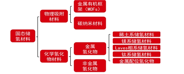 相比氣、液儲(chǔ)氫技術(shù),固態(tài)儲(chǔ)氫技術(shù)需要利用一定性質(zhì)的材料做儲(chǔ)氫介質(zhì)。儲(chǔ)氫材料的種類非常多,主要可以分為物理吸附材料和化學(xué)氫化物材料。物理吸附材料又可以分為MOFs材料和碳納米材料,化學(xué)氫化物材料又可以分為金屬氫化物和非金屬氫化物。