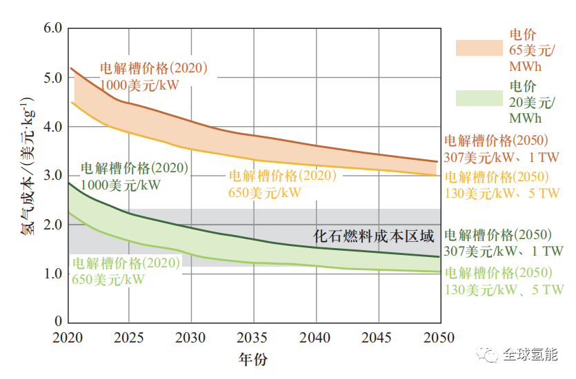 計算假設:2020年產氫能耗51.2 kWh/kg,2050年產氫能耗43.8 kWh/ kg,折舊率8%,電解槽壽命80 000 h,2020年電解槽設備成本為650——1000美 元/kW,2050年成本為130——307美元/kW,且部署容量為1——5 TW。