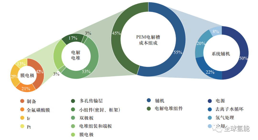 目前正在研究價格更低廉的替代材料,如使用Ti涂層來保持其功能特性不受影響,同時降低成本。稀有金屬Ir是膜電極材料的重要組成部分,在實際應用中,雖然Ir在整個PEM電解系統中成本占比不到10%,但由于供應嚴重不足,可能成為后期PEM電解槽生產的瓶頸。PEM電解制氫系統輔機組成中的水循環和氫氣后處理也是降低成本的重要領域。