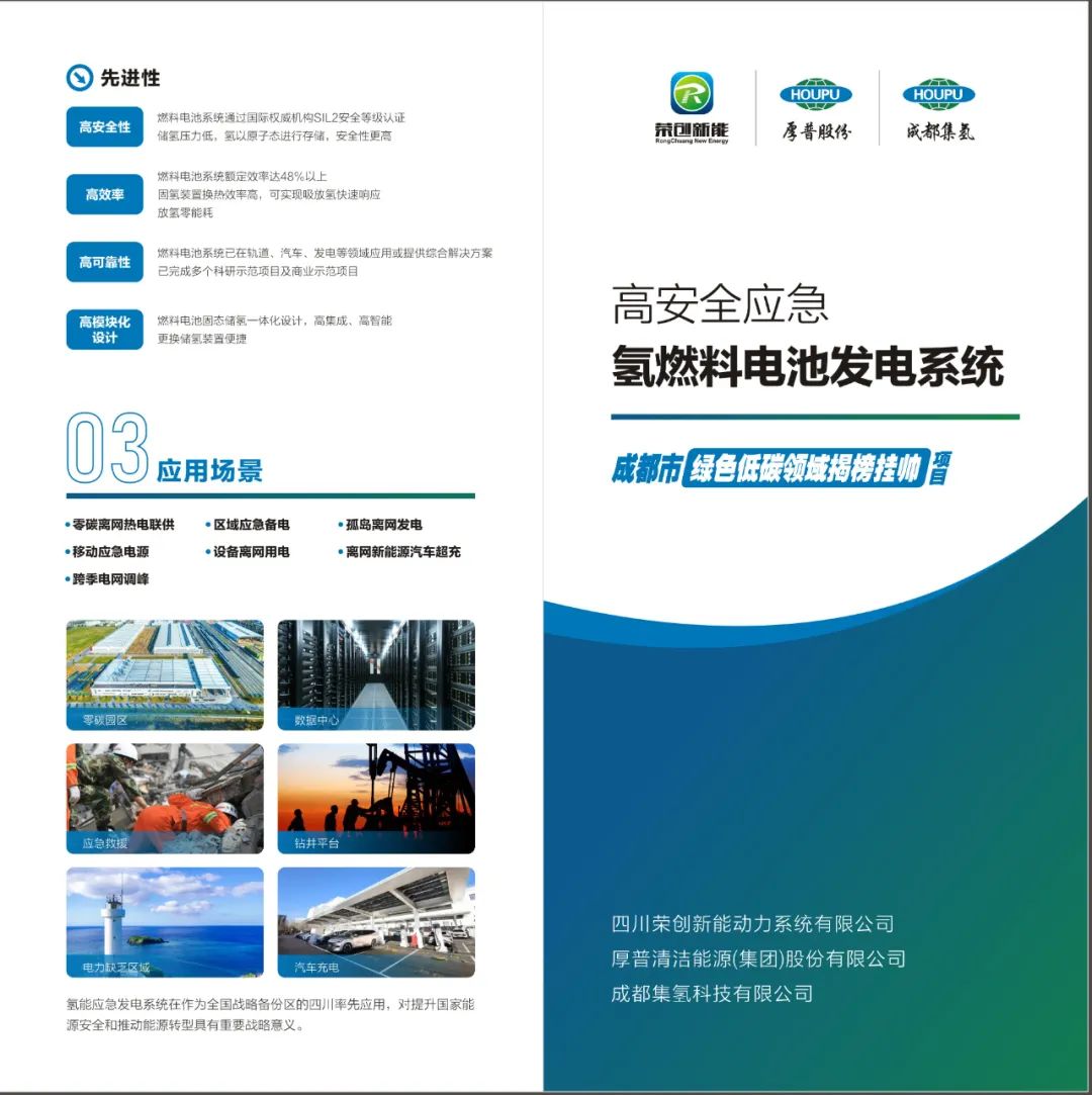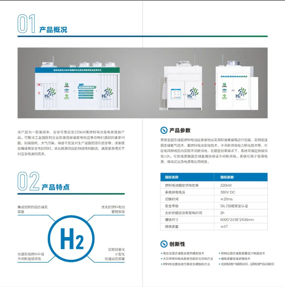 2024年9月,由榮創(chuàng)新能牽頭,聯(lián)合厚普股份、集氫科技申報(bào)成都市科技局“2024年綠色低碳領(lǐng)域揭榜掛帥項(xiàng)目—高安全220kW氫燃料電池應(yīng)急發(fā)電系統(tǒng)”項(xiàng)目。科技攻關(guān)團(tuán)隊(duì)歷時(shí)僅10個(gè)月就完成了研發(fā)任務(wù),比原定計(jì)劃提前了8個(gè)月。這款產(chǎn)品以“燃料電池+固態(tài)儲(chǔ)氫”一體化設(shè)計(jì)為核心,通過五大技術(shù)創(chuàng)新構(gòu)建起安全高效的能源應(yīng)急體系。包含燃料電池發(fā)電、固態(tài)儲(chǔ)氫氫氣供應(yīng)、UPS儲(chǔ)能與供電等功能,設(shè)計(jì)滿足使用單位對(duì)環(huán)保要求、供能保障時(shí)間、應(yīng)急反應(yīng)速度、系統(tǒng)體積等要求,支持輕量化、小型化、快速動(dòng)態(tài)部署,具備快速在線燃料補(bǔ)給、不間斷連續(xù)供電能力。