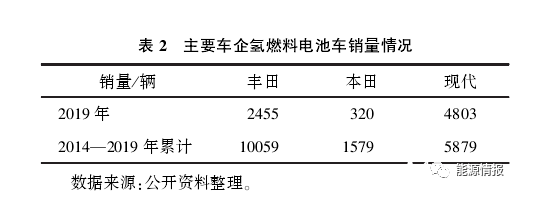 氫燃料電池車尚未規(guī)?;a(chǎn),市場銷量有限。目前,全球最大的氫燃料電池車企業(yè)——豐田公司現(xiàn)有生產(chǎn)能力僅3000輛/年,2020年也只能達(dá)到3萬輛/年,本田、現(xiàn)代、日產(chǎn)、上汽等車企雖相繼推出商業(yè)化車型,但市場銷量依然有限(見表2)。氫燃料電池發(fā)動機(jī)企業(yè)億華通與宇通客車、福田汽車、中通客車等車企合作,建設(shè)了國內(nèi)首條自動化氫燃料電池發(fā)動機(jī)生產(chǎn)線,年產(chǎn)能也僅1萬臺。生產(chǎn)規(guī)模小導(dǎo)致整車成本較高,如豐田公司官網(wǎng)上2020款Mirai售價為58 550美元,是混合動力2020款PRIUS售價(24325美元)的2.5倍,遠(yuǎn)高于消費(fèi)者預(yù)期。