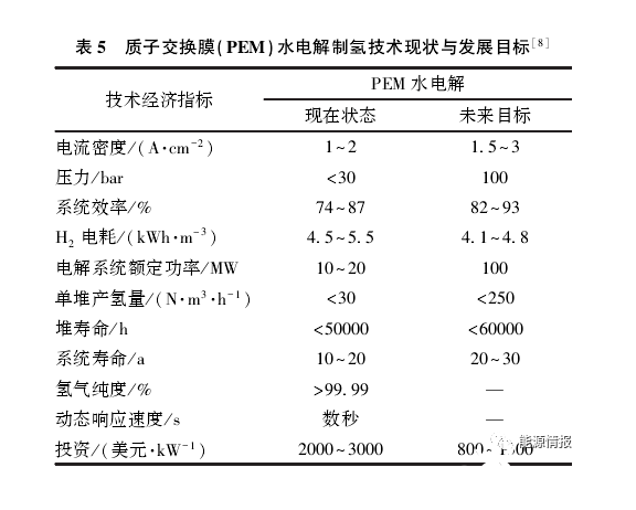 綠色、低成本制氫技術(shù)是氫能產(chǎn)業(yè)發(fā)展的關(guān)鍵。質(zhì)子交換膜(PEM)水電解制氫技術(shù)在總體效率、工作電流密度、氫氣純度、產(chǎn)氣壓力以及動態(tài)響應(yīng)速度等方面優(yōu)于堿性水電解制氫技術(shù)(詳見表5),能適應(yīng)可再生能源發(fā)電的波動性,是氫能產(chǎn)業(yè)鏈發(fā)展的重點(diǎn)技術(shù)之一,但目前面臨采用鉑催化劑、電耗高而導(dǎo)致的制氫成本較高問題。突破鉑催化劑、電堆等關(guān)鍵技術(shù),進(jìn)一步提高電流密度、系統(tǒng)能效、降低投資是PEM制氫技術(shù)的重點(diǎn)開發(fā)方向。