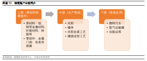 儲(chǔ)氫瓶產(chǎn)業(yè)鏈可以簡(jiǎn)單劃分為上游原材料和零部件,中游生產(chǎn)制造和下游終端應(yīng)用三個(gè)環(huán)節(jié)。其中,上游原材料包括鋁材、鋼材、碳纖維和樹脂等,零部件包括各種金屬閥門和各類傳感器;中游生產(chǎn)制造設(shè)備和制造工藝等;下游則是在燃料汽車、氫氣運(yùn)輸罐、加氫站等場(chǎng)景上的應(yīng)用。在產(chǎn)業(yè)鏈供應(yīng)方面,目前車載儲(chǔ)氫瓶核心材料及零部件如碳纖維主要依賴進(jìn)口,瓶口閥、減壓閥等也主要依賴進(jìn)口,未來這些關(guān)鍵材料和零部件將逐步實(shí)現(xiàn)國(guó)產(chǎn)化。
