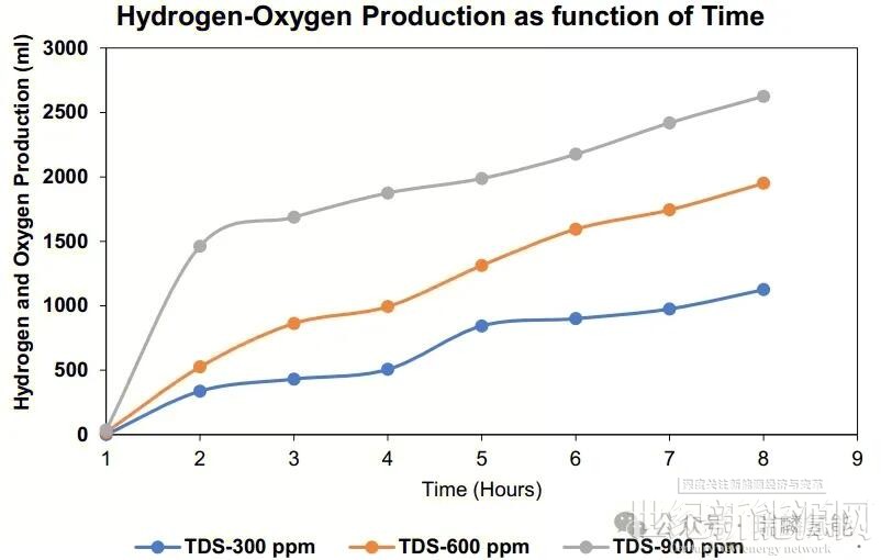 TDS指水中溶解的無機和有機物總濃度,是評估水質的關鍵指標。實驗測試了低(300ppm)、中(600ppm)和高(900ppm)三個TDS水平,結果顯示產氣量隨TDS濃度增加而上升,高TDS可能充當催化劑促進氫氣形成。相反,低TDS水平產氣量有限,TDS為零時無氫氣產出,這與現有研究一致。