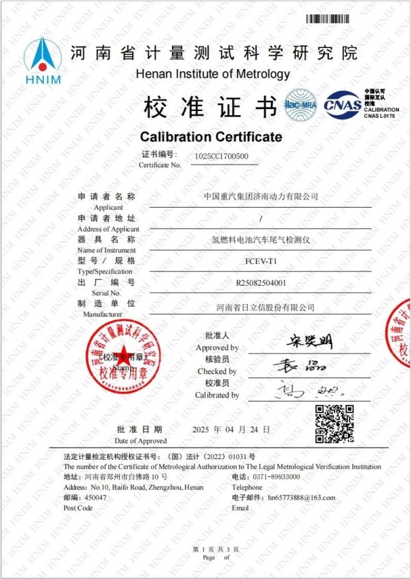 同時,該設備順利通過河南省計量院CNAS校準測試,可精準實現整車氫氣排放的原位快速檢測,為整車廠評估燃料電池發動機性能提供關鍵依據,是氫燃料電池汽車產業鏈中保障安全與性能的重要測量工具。