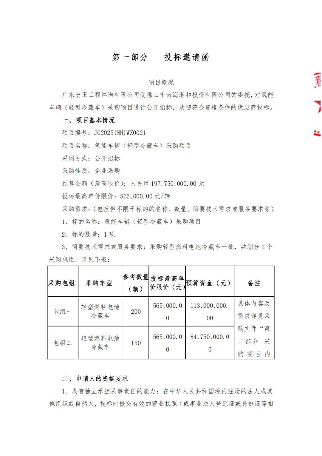 包組一采購輕型燃料電池冷藏車200輛,投標最高單價限價56.5萬元,預算資金11300萬元。