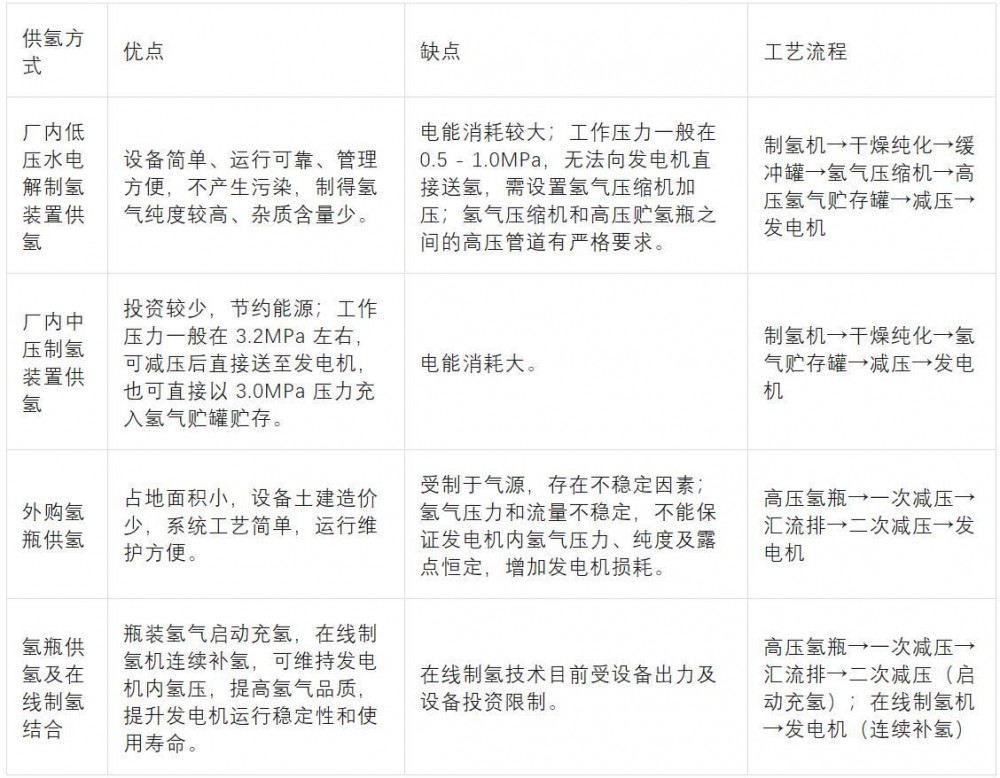 目前電廠內(nèi)的供氫系統(tǒng)主要有三種:廠內(nèi)設(shè)置水電解制氫裝置供氫、外購氫瓶供氫、直接通過管道供氫。此外,還有供氫和制氫相結(jié)合的模式,如通過瓶裝氫氣對發(fā)電機(jī)進(jìn)行啟動充氫,通過在線制氫機(jī)對發(fā)電機(jī)進(jìn)行連續(xù)補氫。以下為幾種常見供氫方式的詳細(xì)對比: