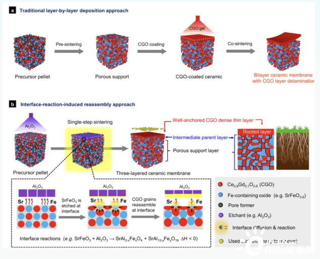 圖1 具有離子傳導(dǎo)致密層的多層陶瓷膜的示意圖 a) 傳統(tǒng)的逐層沉積;b) 界面反應(yīng)誘導(dǎo)的重組 | 參考文獻(xiàn)[1]
