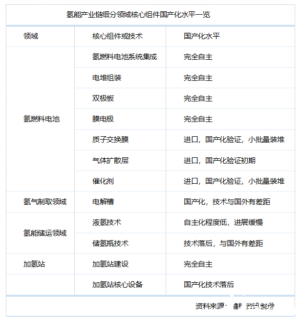 就氫燃料電池汽車產(chǎn)業(yè)鏈各細(xì)分市場(chǎng)來(lái)說(shuō),目前我們?cè)跉淙剂想姵叵到y(tǒng)、電堆方面的推進(jìn)上是最快的,電堆的兩大核心部件 ——膜電極和雙極板,業(yè)已完成國(guó)產(chǎn)化;但是膜電極的三大核心零部件——質(zhì)子擴(kuò)散層、氣體擴(kuò)散層和催化劑,國(guó)產(chǎn)氣體擴(kuò)散層和催化劑在技術(shù)和材料層面都沒(méi)有達(dá)到批量生產(chǎn)供應(yīng)的條件,質(zhì)子擴(kuò)散層國(guó)產(chǎn)進(jìn)度相對(duì)快一些,但是也僅僅是小批量裝堆的水平。在電解水制氫設(shè)備、高壓氣態(tài)和液氫儲(chǔ)運(yùn)技術(shù)以及儲(chǔ)氫瓶、還有加氫站壓縮機(jī)等領(lǐng)域,我們的發(fā)展沒(méi)有那么順利,國(guó)產(chǎn)化推進(jìn)相對(duì)緩慢,是這兩三年發(fā)展氫能行業(yè)卡脖子的關(guān)鍵節(jié)點(diǎn)。