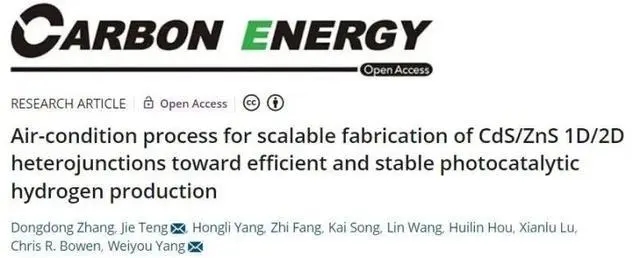 Air-condition Process for Scalable Fabrication of CdS/ZnS 1D/2D Heterojunctions toward Efficient and Stable Photocatalytic Hydrogen Production. Carbon Energy, 2022. DOI: 10.1002/cey2.277