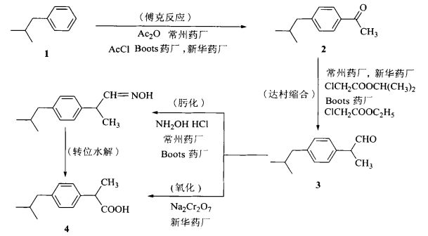 早期的布洛芬合成路線是以異丁基苯(1) 為原料,經傅克反應生成對異丁基苯乙酮(2),再經達村縮合( Darzenscondensation) 生成 1-( 4-異丁基苯基) 丙醛(3),最后或經氧化得布洛芬 4,或是通過 3 的肟化反應,再經水解制得。合成反應式如圖2所示。