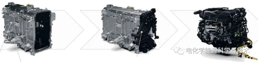 介質分配板(中圖),介質分配板是燃料電池堆處用于空氣和氫氣以及高溫冷卻液的界面。氫循環路完全集成到燃料電池堆外殼的介質分配板上。通過被動引射器系統實現氫氣的再循環。所有其他輔助部件,如空壓機和DC/DC轉換器,可以隨后安裝到框架外殼上。
