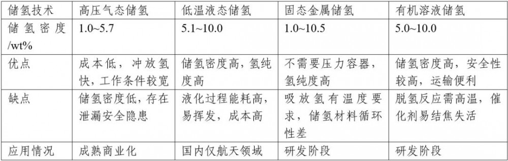 目前,儲氫主要有兩種方式:一是物理儲氫,如高壓氣態(tài)儲氫、低溫液態(tài)儲氫;二是化學(xué)儲氫如固態(tài)金屬儲氫、有機(jī)溶液儲氫。幾種典型儲氫技術(shù)性能對比如表1所示。