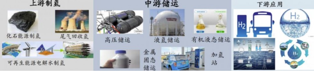 氫能作為二次能源,從一次能源轉(zhuǎn)換獲得后,再運(yùn)輸至用能終端,最終轉(zhuǎn)化為電力、熱能或機(jī)械動力。氫能的產(chǎn)業(yè)鏈可概括為“氫氣制取、氫氣儲運(yùn)、氫氣應(yīng)用”三個(gè)環(huán)節(jié)。