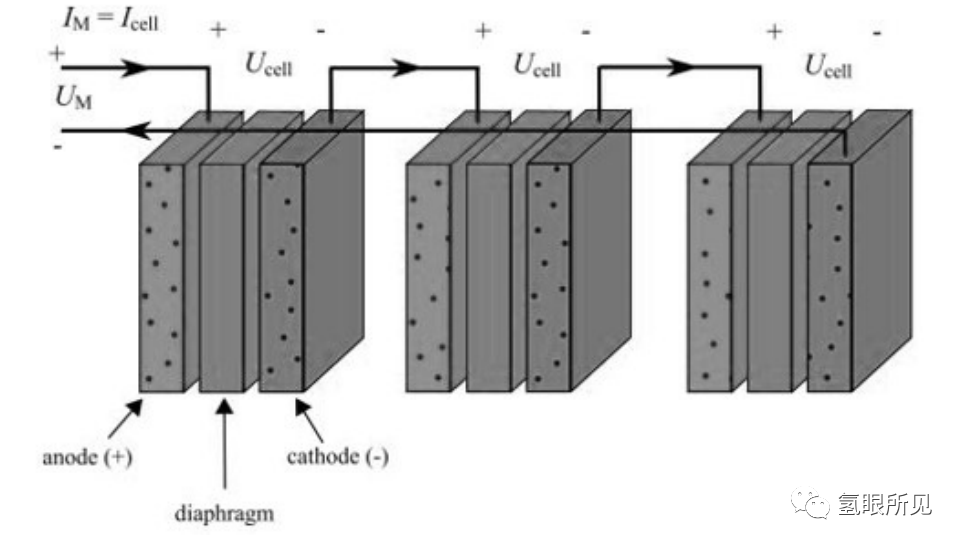 在雙極結(jié)構(gòu)中,每個電解槽串聯(lián)形成一個電解堆大模塊,如圖2所示。因此,單個電極對之間的所有電壓之和等于電池的總電壓,電池電流直接等于通過每個電池的電流。此外,在這種結(jié)構(gòu)中,兩個不同的電化學(xué)反應(yīng),析氫反應(yīng)和析氧反應(yīng)發(fā)生在每個電極的兩側(cè)。因此,電極的一邊同時作為陰極,另一邊作為陽極。