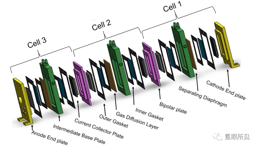 最后,將這些實物部件在各層之間保持適當?shù)拈g距組裝在一起,形成雙極電解堆。圖11用solidworks零件說明了雙極電解堆內(nèi)部部件的合理布置。