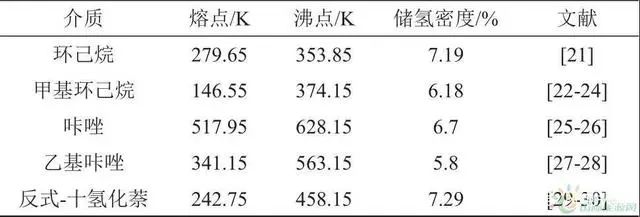 有機液體儲氫技術基于不飽和液體有機物在催化劑作用下進行加氫反應,生成穩定化合物,當需要氫氣時再進行脫氫反應。常用的不飽和液體有機物及其性能如表所示。