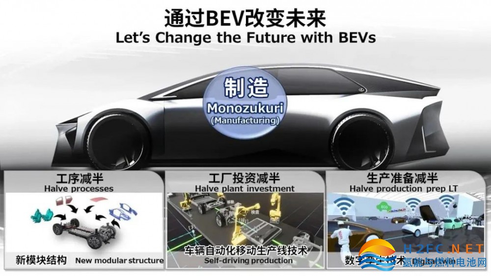 加藤總裁談到:“之所以次世代BEV能夠完成‘商品的進(jìn)化’,正是因?yàn)楸澈笫?lsquo;制造的再次進(jìn)化’。如果用一個(gè)詞來詮釋制造的未來,應(yīng)該是‘二分之一’。也可稱之為‘BEV half’。通過模塊結(jié)構(gòu)和車輛自動(dòng)化移動(dòng)生產(chǎn)線技術(shù)將生產(chǎn)工序和工廠投資分別減至二分之一。通過數(shù)字孿生技術(shù)賦能,生產(chǎn)準(zhǔn)備時(shí)間將減少至二分之一。”
