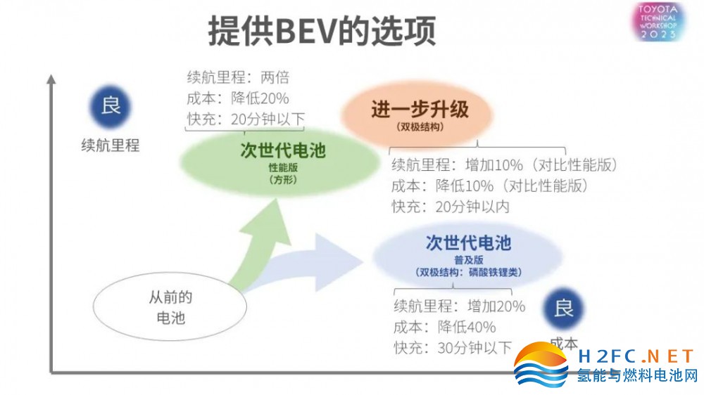 本次說明會(huì)首次公開了兩款有望被搭載到次世代BEV產(chǎn)品上的鋰離子電池,分別為“性能版電池”與“普及版電池”。