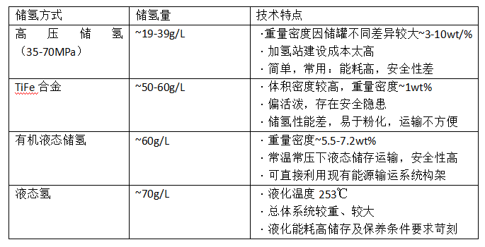 儲氫方面,有機液態(tài)儲氫的儲氫量大,儲氫密度高。高壓儲氫和固態(tài)合金儲氫,儲氫密度高達60g/L,可逆儲氫量可達5.6wt%。