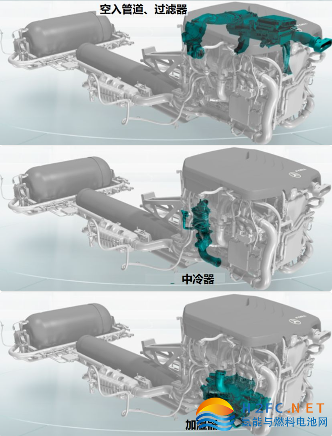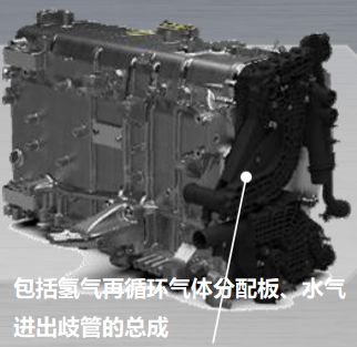此外,奔馳GLC F-CELL為提升燃料電池系統功率密度,對相關零部件進行了高度集成開發,比如對進氣端板集成化,即將水氣進出歧管和氫氣再循環分配板高度總成;集成多個空氣部件,如加濕器和水氣分離器集成等。