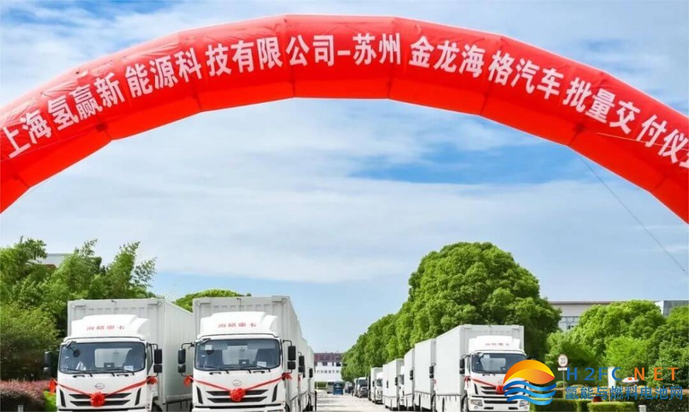 6月26日,60輛蘇州金龍海格汽車氫能卡車,正式交付廣泰氫能全資子公司上海氫贏新能源科技有限公司。這批18噸燃料電池廂式貨車投運,有望成為燃料電池汽車在物流領域運營的新范本。