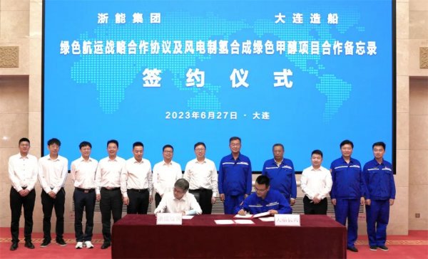 6月27日,中國船舶大連造船與浙能集團(tuán)簽署綠色航運(yùn)戰(zhàn)略合作協(xié)議及風(fēng)電制氫合成綠色甲醇項(xiàng)目合作備忘錄。