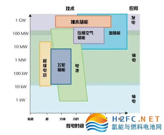 從整個(gè)儲(chǔ)能系統(tǒng)來看,儲(chǔ)能密度、放電功率及儲(chǔ)存時(shí)間三大參數(shù)對于儲(chǔ)能能力起著關(guān)鍵性的作用。從下圖可以看出無論從哪個(gè)維度來看,氫儲(chǔ)能都具有較大的優(yōu)勢,而且更加適用于大規(guī)模儲(chǔ)能中。